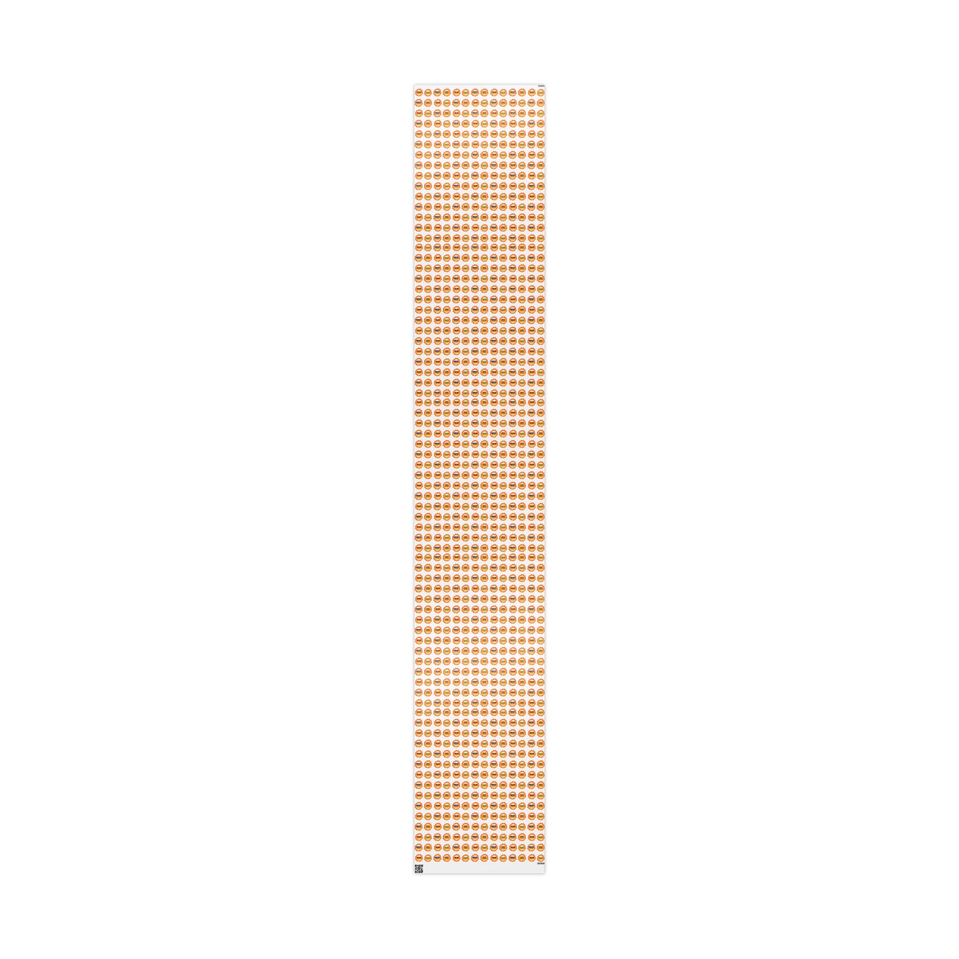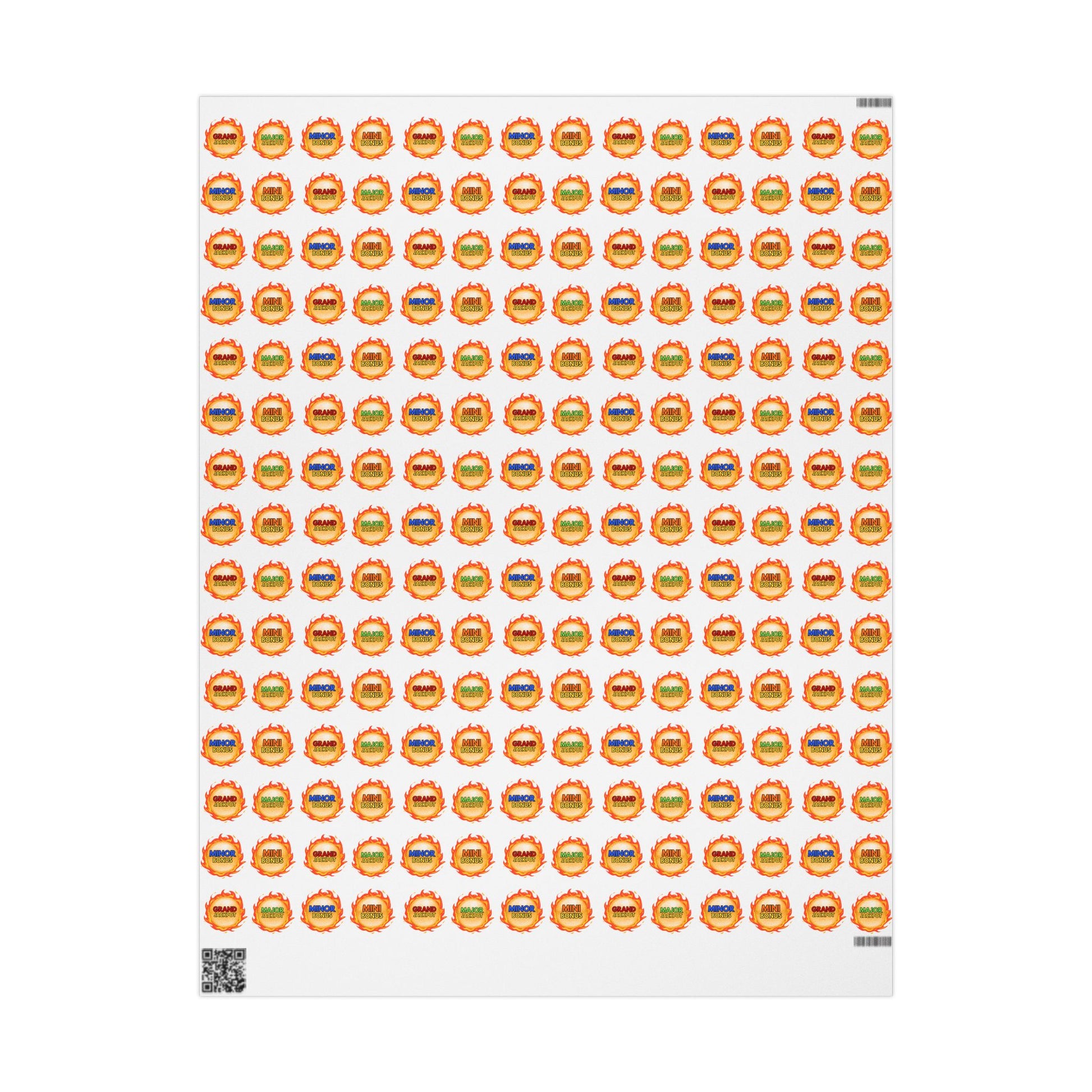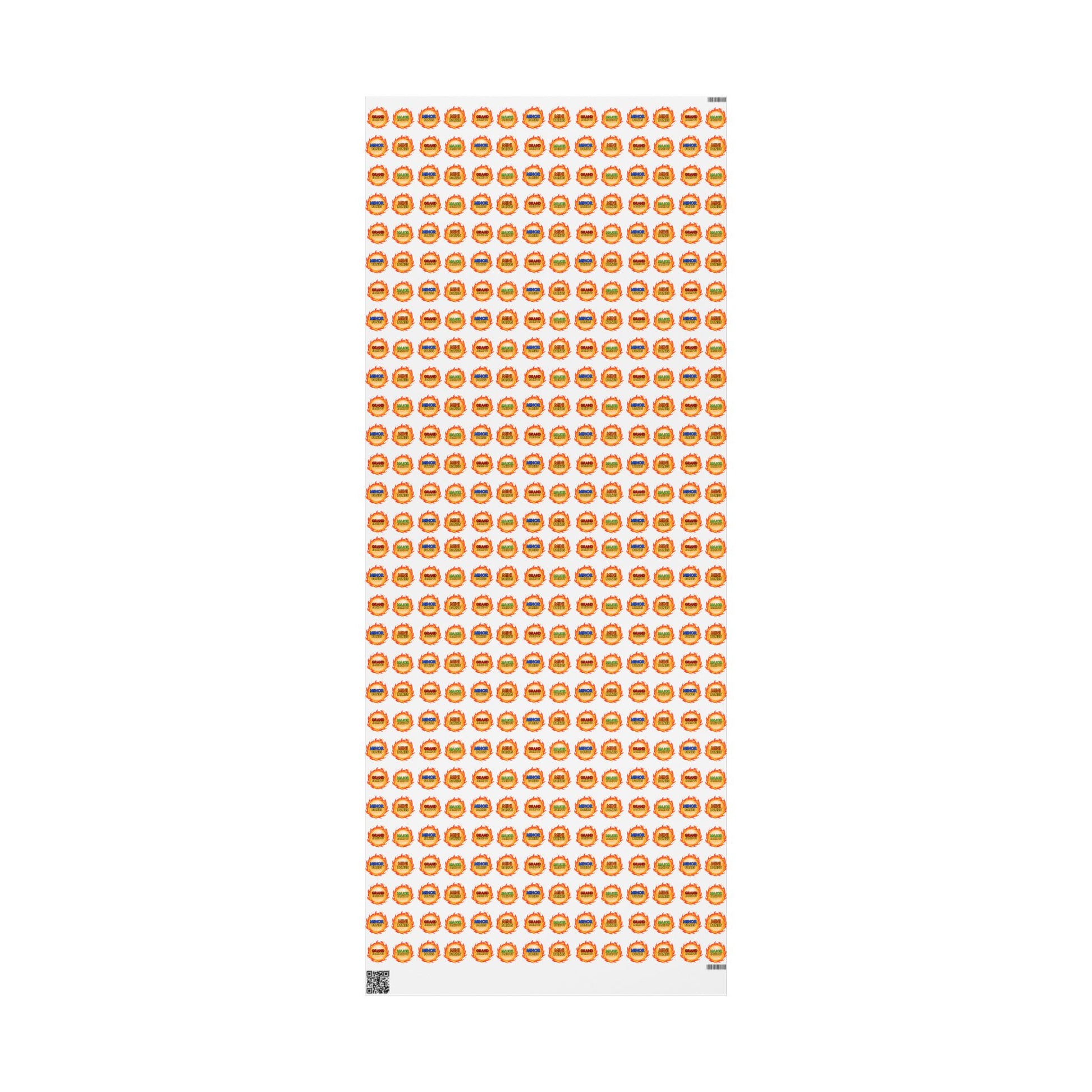A playful, vibrant wrapping paper printed on premium 90 gsm fine art paper. Bright flame badges — labeled Mini, Minor, Major and Grand — float against a clean white field, letting the badges pop while keeping a modern, minimalist feel. Choose a glossy finish for vivid color and shine, or a smooth matte for a refined, photo-like look. Available in three generous lengths to cover tiny treats or large parcels. The one-sided print keeps the reverse clean for easy tape and handling; note there are small white margins with a manufacturer barcode and QR code at the sheet edges.